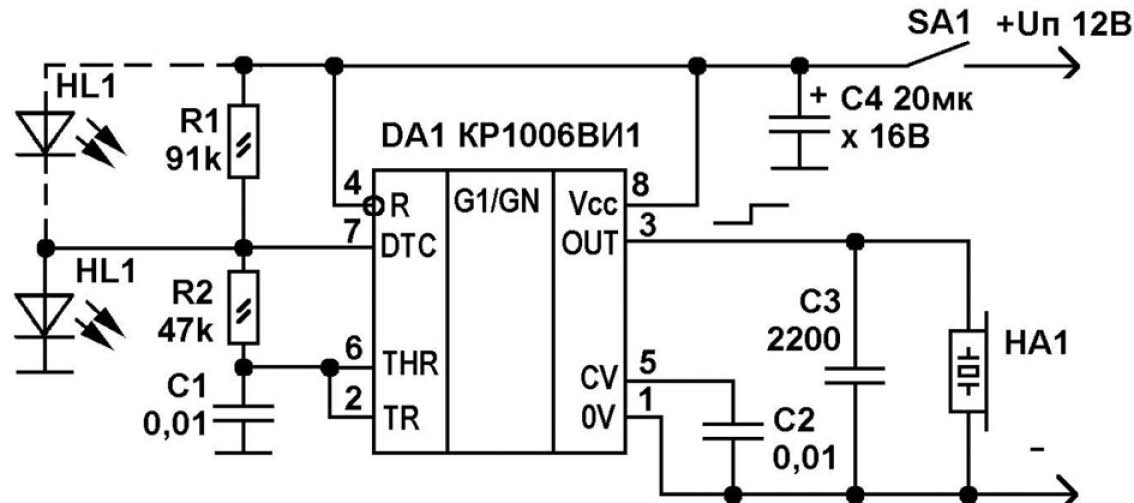 В данном случае вход управления положительным импульсом микросхемы КР1006ВИ1 шунтируется светодиодом на общий провод. Во время активного свечения HL1 частота звукового сигнала минимальна.