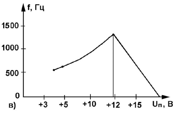 При увеличении питающего напряжения свыше 12 В характер чередования сигнала не меняется, но изменяется сама граница частоты. Так, при Un=15 В верхний предел частоты уже не 1200 Гц, а более 1500. При увеличении питающего напряжения свыше 16 В генерация срывается.
