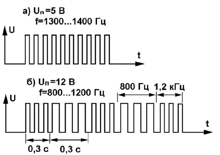 При уменьшении Un до 5 В фиксируется прерывистый звуковой сигнал с базовой частотой генератора 800 Гц. При уменьшении Un до 3,5 В пьезоэлектрический капсюль HA1 излучает однотональный сигнал соответствующей (напряжению питания) амплитуды и частотой, примерно равной 600 Гц.