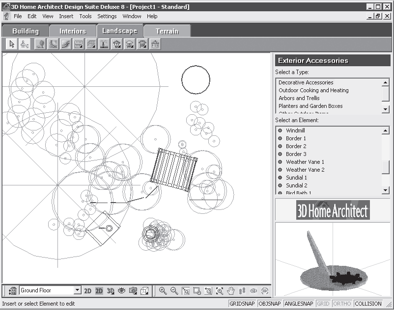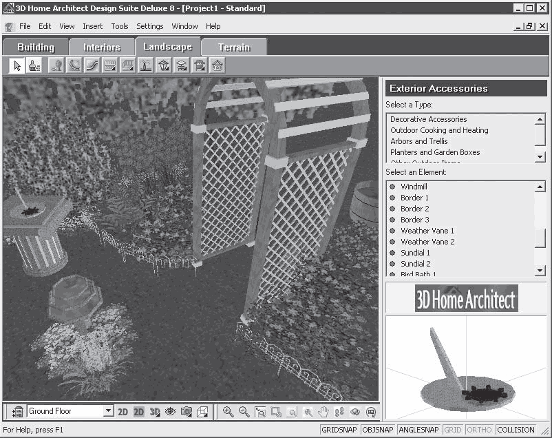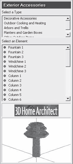 Внесем еще немного дополнительных элементов из библиотеки программы, создавая уютный уголок на участке. В верхнем списке Select a Type (Выделить тип) выберем тип дополнительного элемента Decorative Accessories (Декоративные вспомогательные элементы) (см. рис. 8.10), а в нижнем списке Select an Element (Выделить элемент) – элемент библиотеки Column 1 (Колонна 1).