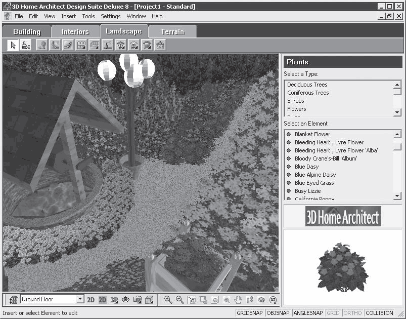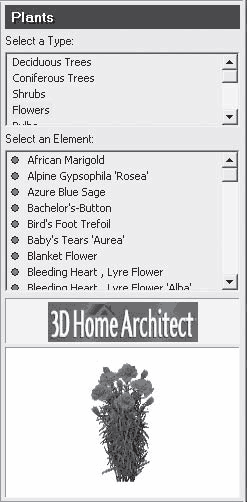 Кроме перечисленных компонентов, можно добавить в проект зеленые насаждения, выбрав их из библиотеки Plants (Растения) и украсив ими участок по своему вкусу.