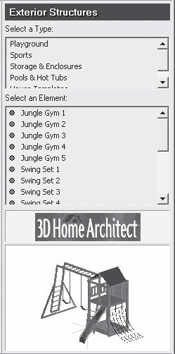 В категории Exterior Structures (Внешние сооружения) содержатся группы внешних сооружений, которые можно внести в проект. Например, группа Playground (Игровая площадка) содержит множество элементов игровых площадок и городков, качели, кольца, детские домики и карусели, а группа Sports (Спорт) – спортивные сооружения, теннисные и бадминтонные корты, волейбольные и баскетбольные площадки.