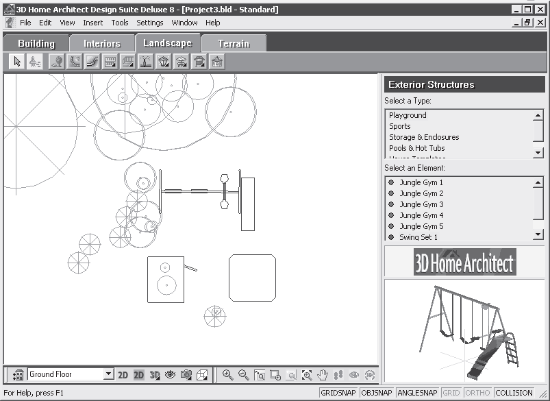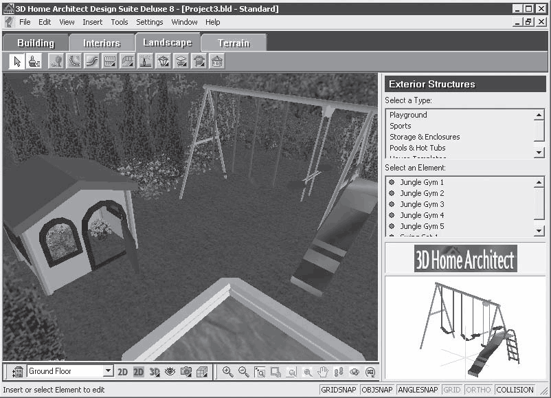 Щелкните кнопкой мыши на группе Playground (Игровая площадка) в верхнем списке Select a Type (Выделить тип), а в нижнем списке Select an Element (Выделить элемент) – на элементе библиотеки Swing Set 1 (Стационарные качели 1).