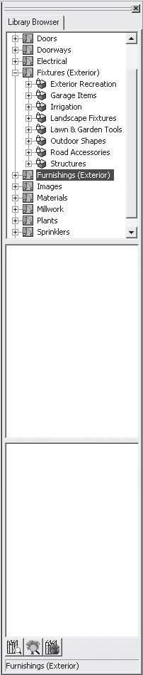Внесем в план садовую скамейку для отдыха. Для этого щелкните кнопкой мыши на значке «плюс» рядом с папкой Furnishings (Exterior) (Внешняя обстановка), чтобы открыть ее содержимое, найдите в ней папку Exteriors Benches (Внешние скамьи) и откройте ее.