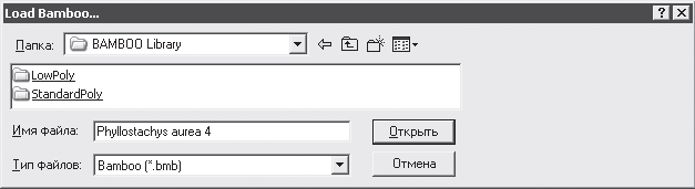 Если, выбрав требуемый кустарник из библиотеки, например Phyllostachys nigra 7 (Черный листополосник 7), нажать кнопку Открыть, то на экране появляется не весь куст, а только один элемент в виде ветки (рис. 9.4).