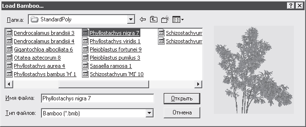 Откройте папку StandardPoly (Многошаблонная), чтобы отобразить ее содержимое, – в данной папке находится множество файлов, содержащих компоненты библиотеки. Если навести указатель мыши на любой из этих файлов, например на файл Phyllostachys nigra 7 (Черный листополосник 7), то в области просмотра в правой части окна отобразится внешний вид выбранного компонента (рис. 9.3), что очень удобно при выборе объекта в библиотеке.