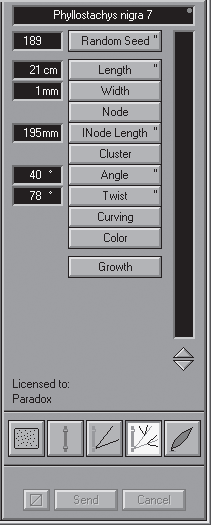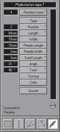 В правом нижнем углу окна программы расположена панель инструментов Licensed to Paradox (Редактирование элементов), предназначенная для редактирования листьев, больших и малых веток, ствола и способа расположения отдельных элементов в массиве куста (рис. 9.5).