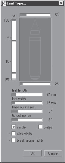 Можно менять длину и ширину листьев, форму начала и конца листа. Установка переключателя в положение simple (простой) придаст листьям на экране упрощенную угловатую форму, что позволит снять нагрузку на ресурсы компьютера. При отсутствии такого выделения листья отображаются в точном соответствии с указанными размерами. Если установить переключатель в положение plates (пластинки), то листья отображаются в виде простых пластин без закруглений.