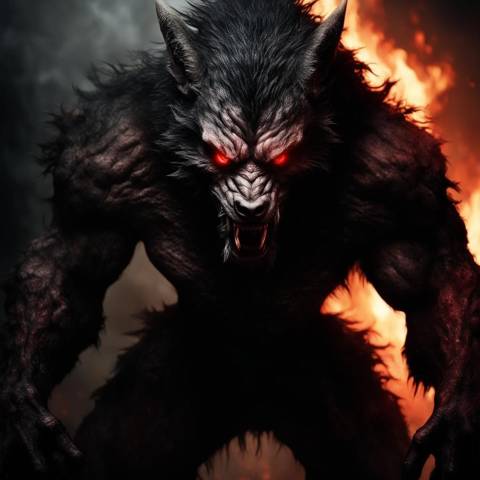 Он был гораздо крупнее своих собратьев и выглядел, как плод любви волка-оборотня и черта. Разве что копыт ему не хватало. Ростом он был более двух метров, с ярко выраженными буграми мускулов под чёрной шерстью. А глаза его горели красными огнями, в которых буквально чувствовалась необузданная агрессия.