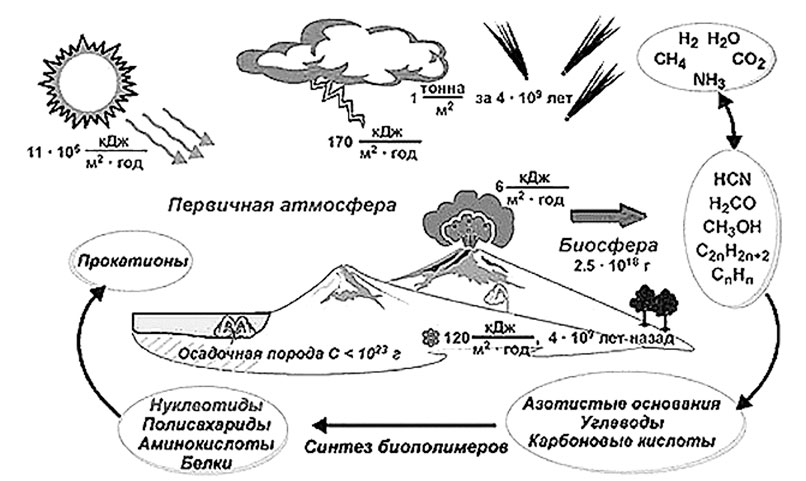 Под действием ультрафиолетового излучения, высокой температуры окружающей среды, электрических разрядов молний и активной вулканической деятельности в атмосфере нашей планетынепрерывно образовывались различные органические соединения, которые затем попадали в океан. Концентрация органических соединений в воде постоянно увеличивалась, и в конечном итоге воды океана стали «бульоном» из пептидов,[16]16