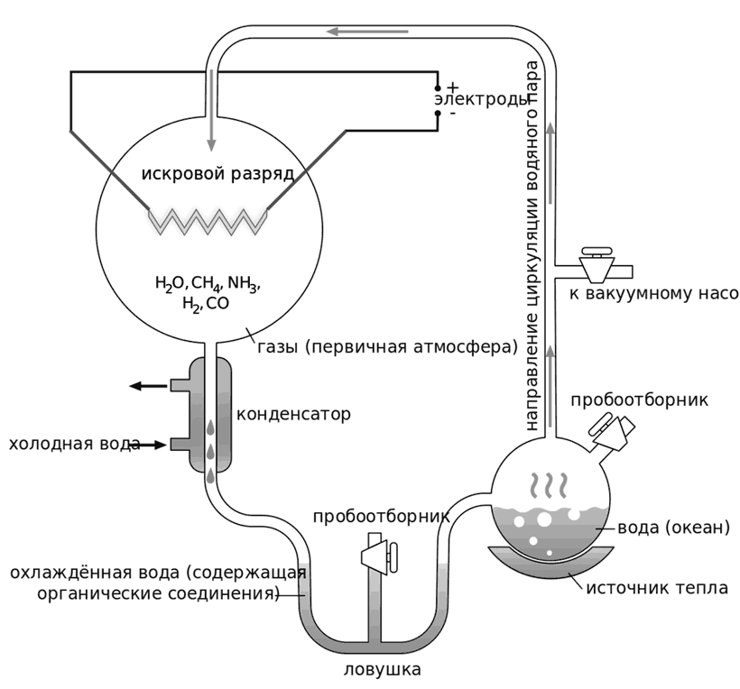 Возможность абиогенного синтеза высокомолекулярных органических веществ была экспериментально доказана в 1953 году американскими учеными Стэнли Миллером и Гарольдом Юри. Для проведения эксперимента был создан аппарат, состоявший из двух стеклянных колб, соединенных в замкнутую цепь (см. рисунок). В одну из колб было помещено устройство, имитирующее грозовые эффекты – два электрода, между которыми регулярно происходил электрический разряд напряжением примерно в 60 000 вольт. В другой колбе постоянно кипела вода. Аппарат был заполнен смесью газов, соответствовавшей тогдашним представлениям о составе атмосферы ранней Земли. Смесь состояла из метана (CH4), аммиака (NH3), водорода (H2) и монооксида углерода (CO).