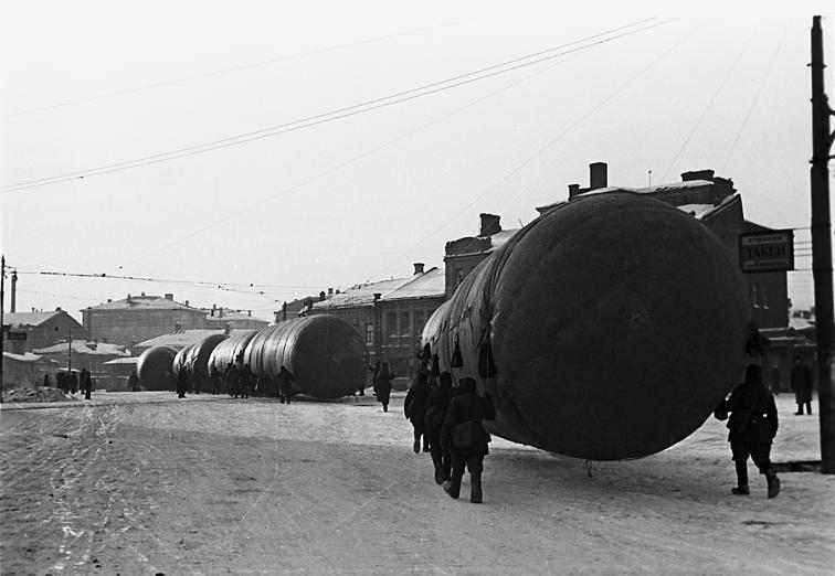 Военные несут баллоны с газом для аэростатов заграждения. 1941 г.
