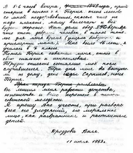 Заявление В. Дроздовой об изнасиловании ее Л. Берия в 1949 году