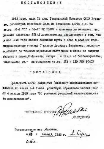 Дополнительное обвинение Л. Берия в изнасиловании В. Дроздовой предъявлено 15 июля 1953 года в 0 часов 15 мин.