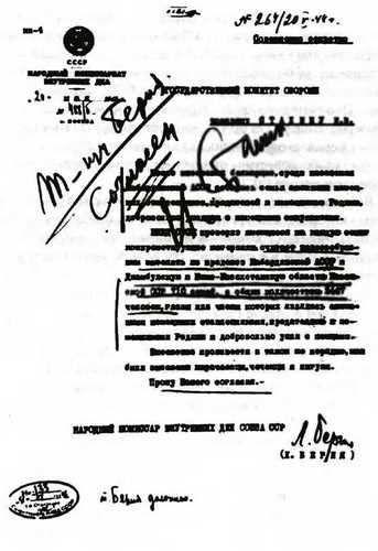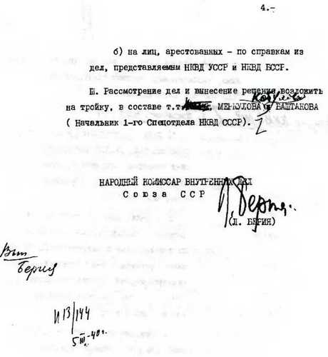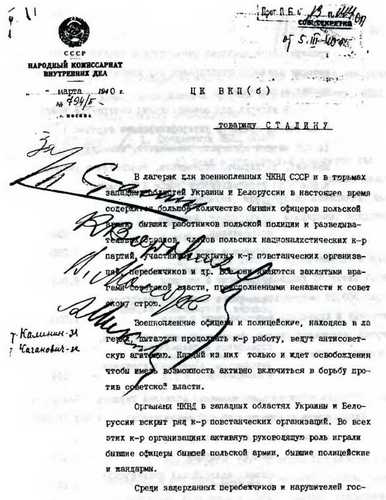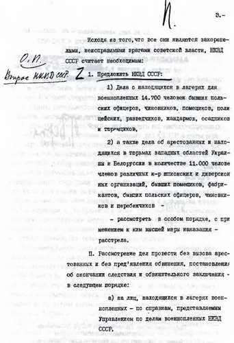 (И Сталин, К. Ворошилов, В. Молотов, А. Микоян – «за» ликвидацию польских офицеров, М. Калинин и Л. Каганович согласие дали по телефону, о чем сделана отметка Поскребышевым) (Фамилия Кобулова вместо Берия вписана Сталиным) Предложил Берия, Политбюро ЦК ВКП(б) согласилось. Кто должен отвечать?