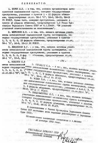 В нашем случае ситуация была похожая. Обвинительное заключение было составлено в прокуратуре. Отредактировано и утверждено, правда, в ЦК с участием М.А. Суслова и подписано генеральным прокурором Р.А. Руденко как следователем. Но это не самое главное.