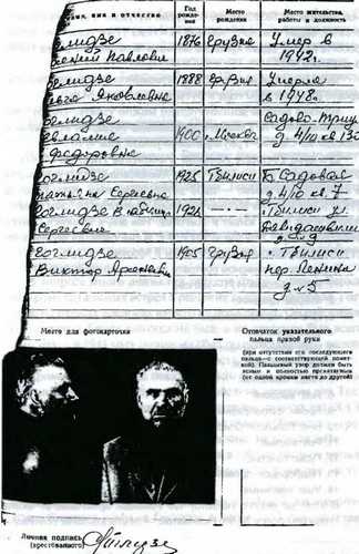 Терехов вновь уточняет у Гоглидзе уже известные анкетные данные. Они полностью совпадают со справками кадровых органов. Есть некоторые детали. Гоглидзе уточняет, что первый муж его жены Антадзе через шесть лет после того, как жена с ним, Антадзе, разошлась, был в 1937 году арестован и по приговору Военной коллегии Верховного суда СССР расстрелян как участник контрреволюционной заговорческой военной организации.