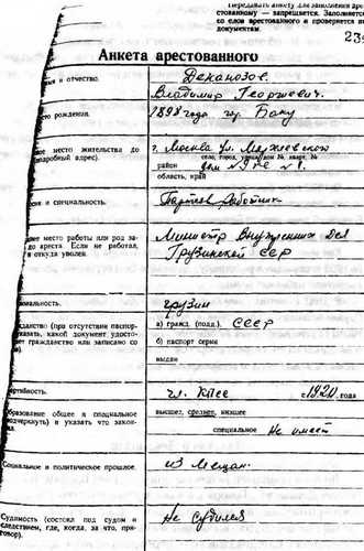 При аресте в Лефортовской тюрьме на Деканозова заполнена анкета. Это сделано, как следует из записей, секретарем Лефортовской тюрьмы МВД СССР лейтенантом Беляковым. Арестован он был согласно ордеру МВД 30 июня 1953 года.[81]81