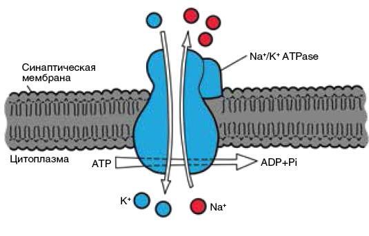 Натрий-калий-зависимая аденозинтрифосфатаза (молекула, выполняющая роль натрий-калиевого насоса) расщепляет молекулу АТФ, что позволяет ей набраться сил и выбросить во внешнюю среду три иона Na+, запустив обратным током внутрь себя два иона К+.
