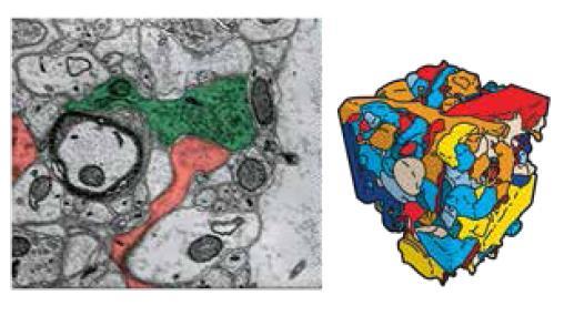 Рис. 22. На изображении слева – срез нервной ткани, осуществляемой для последующего JD-моделирования коннектома (справа) – всех связей между нейронами мозга.