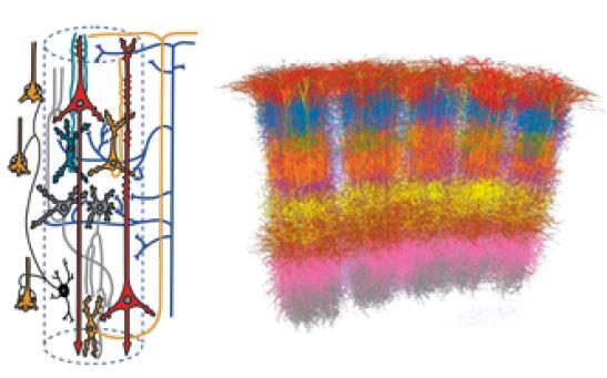 Рис. 23. Слева представлена схема организации одной микроколонки, а справа – организация этих мини-колонок в более крупные образования – макроколонки, гиперколонки.