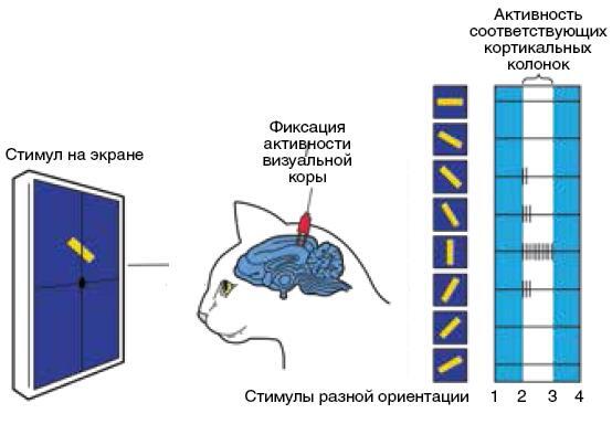 Д. Хьюбела и Т. Визеля (справа на вертикальной диаграмме изображены предъявляемые животному стимулы, слева – интенсивность реакции нейронов зрительной коры, в которые был установлен воспринимающий нейронные разряды электрод).