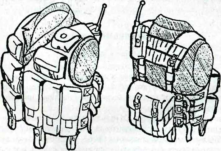 Такая компоновка выгодна тем, что позволяет разделить нагрузку на боевую и бытовую (дополнительную). Боевая экипировка в основном находится в подсумках, закрепленных на грудных планшетах. Ее обычный комплект таков: 8 магазинов (два боекомплекта) для автоматов АК-47 или АК-74 или столько же для РПК, 6 ручных гранат типа Ф-1 или РГД-5 (устройство подсумков для гранат позволяет вынимать и бросать их одной рукой). Расположение магазинов на груди повышает пулестойкость снаряжения.