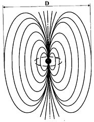 Рисунок. Очень условная графическая модель соотношения между первичным точечным вихрем и генерируемым им вихревым полем. Величина D стремится к бесконечности