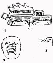 Рис. 136. Уникальная деревянная маска, найденная в сухой пещере Каньон-де-ла-Мано недалеко от Игуалы (штат Герреро). По всей видимости, изначально была украшена инкрустацией из камней, вулканического стекла или раковин. Высота 18 см. Прорисовка.