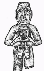 Рис. 22. Монумент 2 с изображением двух карликов, которые в позе «атлантов» поддерживают верхнюю часть трона {или верхнюю челюсть Ольмекского Дракона}. Портеро-Нуэво. Высота монумента 94 см (по: [Сое, 1984, р. 69]).