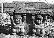 После возвращения из армии Ф. Дракера команда М. Стирлинга снова была в боевом составе. В ходе очередного полевого сезона экспедиция занималась расчисткой центральных частей Сан-Лоренсо и Теночтитлана, а также рытьем серии траншей через крупные насыпи. Среди наиболее ярких находок были пять новых каменных голов из Сан-Лоренсо, а также уникальный алтарь из расположенного неподалеку местечка Портэро-Нуэво (Portero Nuevo). Он изображал композицию с двумя человеческими фигурками, которые наподобие античных атлантов поддерживали верхнюю часть алтаря (рис. 22). В конце сезона М. Стирлинг выразил уверенность, что Сан-Лоренсо был «одним из наиболее богатых и интересных памятников с монументами в Новом Свете…»[66].