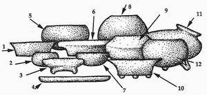 Рис. X. Наиболее распространенные формы сосудов в культурах Мезоамерики: 1, 10 – блюда («тамале»); 2, 8 – текоматес 3, 6 – ритуальная посуда; 4 – тарелка {«комаль»); 5. 7, 9 – молкахете; 11 – патохо; 12 – «текомате»-трипод (сосуд на трех ножках).