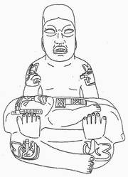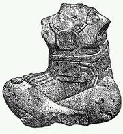 Рис. 80. Поврежденное скульптурное изображение сидящего со скрещенными ногами человека. Монумент 23. Ла-Вента. Особый статус персонажа подчеркнут крупным зеркалом на груди (по: [Drucker, Heizer, Squier, 1959, p. 203]).