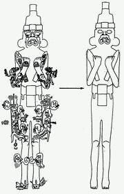 Одним из таких ключей, по мнению ряда специалистов, является знаменитая фигура из Лас-Лимас. По мнению М. Ко, ягауроподобный младенец на руках сидящего человека и четыре изображения (эмблемы) сверхъестественных существ, нанесенные в стиле татуировки на его плечах и ногах, являются своеобразным «Ольмекским Пятикнижием», одним из древнейших изображений ольмекских божеств (рис. 91, 92)[257].