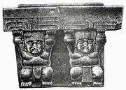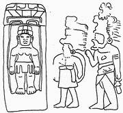 – легендарные (мифические) персонажи. К ним относятся увеличенные изображения людей (правителей, жрецов) на алтарях-тронах в нишах, которые символизируют пещеру как место появления человека в момент создания. Эти персонажи в ряде случаев держат на руках (принося в жертву?) ягуароподобных младенцев;