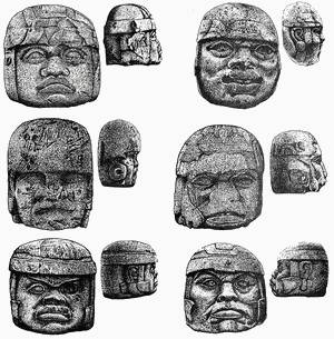 Колоссальные каменные головы являются своеобразной визитной карточкой ольмекской культуры. Сегодня их известно 17: десять в Сан-Лоренсо (рис. 97-106), четыре в Ла-Венте (рис. 107–110), две в Трес-Сапотес (рис. 111, 112) и одна – из Ранчо Кобата (рис. 113). Все они отличаются индивидуальными размерами, чертами лица, разными головными уборами в виде шапочек-шлемов для игры в мяч, деталями прически и ушных украшений. Расчеты, приводимые Б. де Ла Фуэнте, показывают, что каменные головы были созданы древними мастерами с соблюдением правила «золотого сечения» (рис. 114).