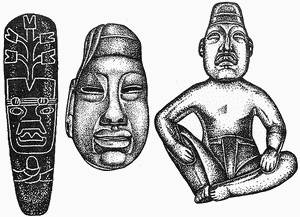 Традиционно все ольмекские произведения искусства подразделяются на две категории: монументальная скульптура[263] и малые (портативные) формы. В настоящее время известно ок. 250 каменных ольмекских монументов. Видный в этой области специалист Б. де Ла Фуэнте выделяет три основных темы в монументальной скульптуре: