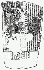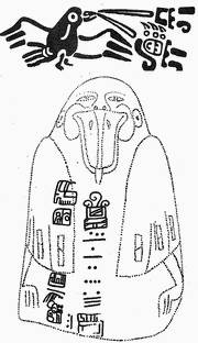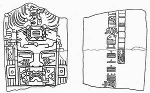 На трапециевидной базальтовой плите (размером 2,34 х 1,42 м и весом до 4 т), частично поврежденной эрозией, была вырезана фигура богато одетого мужчины в сложном головном уборе с масками, на которых специалисты различают стилизованные изображения хищной птицы и акулы[283]. Сверху и рядом с изображением располагалось ок. 400 знаков, организованных в 21 колонку. Часть из них была уже знакома по статуэтке из Тустлы, а кроме того, на стеле были записаны две даты -8.5.3.3.5. (21 мая 143 г. н. э.) и 8.5.16.9.7. (13 июля 157 г. н. э.).
