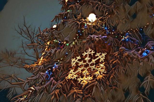 В ранних зимних сумерках красиво светились огоньки на городской ёлке, на фонарных столбах вокруг площади, на солидных зданиях, окружавших ледяной городок.