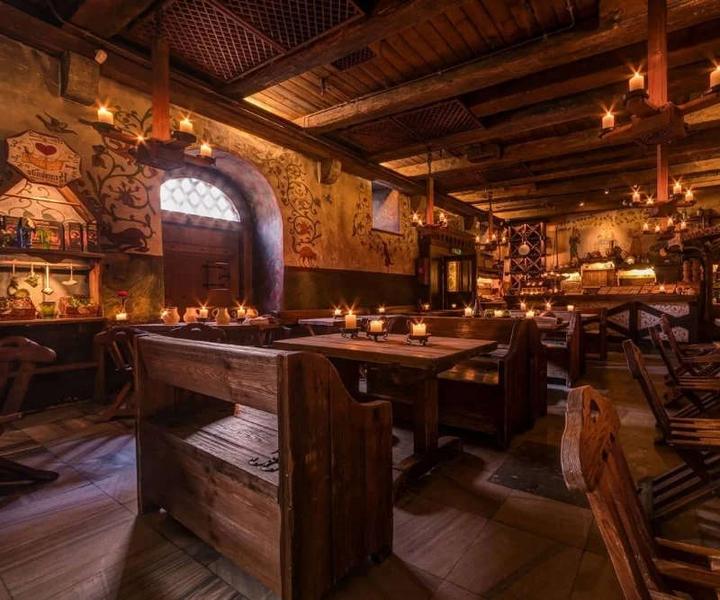 «Кухня», – без труда догадался я, успев увидеть за закрывающейся дверью большую плиту с шипящими сковородками и бурлящий котел на открытом огне очага. К огню, над которым висел котел, примостились пара вертелов с насаженными на них мясными тушками каких-то мелких страдальцев. Не прошло и минуты, как из дверей кухни в сопровождении крепыша вышел невысокий мужчина лет сорока пяти. Он был похож на свое изображение на вывеске. Так, наверное, и должны выглядеть владельцы преуспевающих харчевен. Победно выпирающий вперед живот, налитые довольством щеки, весьма дорогая одежда и пара золотых колец сразу показывали собеседнику, что он общается с преуспевающим человеком.