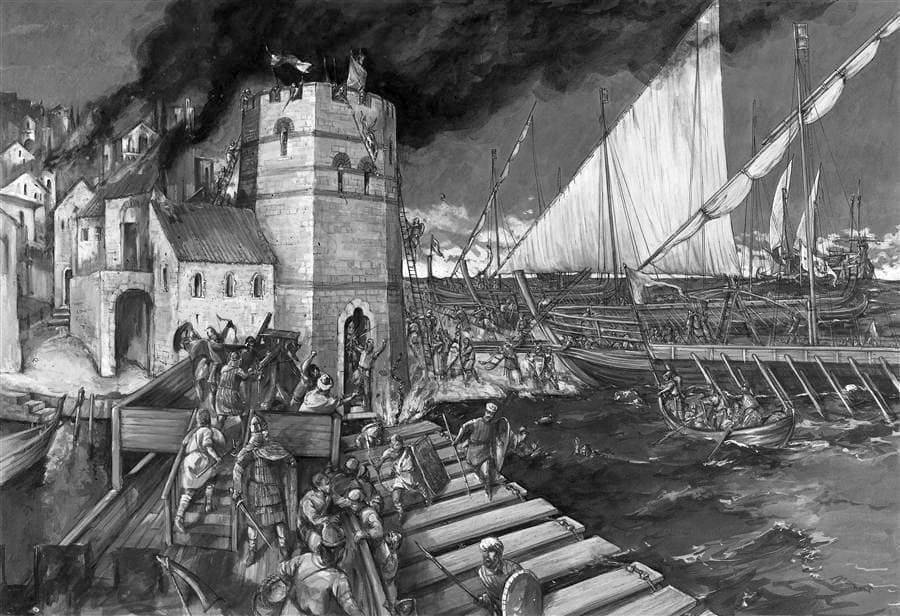 – Капитан! – позвал Петар Зосима. – Передайте сигналы флоту: десантируемся в порту и сходу атакуем город! «Волку» и «Тюленю» перейти в тыл строя и закрыть рейд, остальным открытым стругам – в первую волну атаки! Чердачным стругам при входе в порт взять когги на буксир и к пристани! Они – вторая волна атаки! Абордажные команды коггов – третья волна атаки! Расчётам баллист – поддержка десанта! Экипажи кораблей и расчёты огнемётов – защита флота!