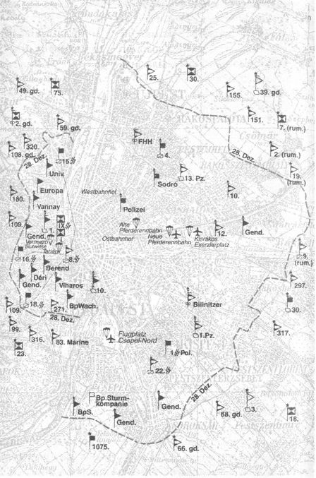 Если говорить о действительно боеспособных частях, то надо, прежде всего, упомянуть оставшиеся в Будапеште дивизионы самоходных артиллерийских установок. Несмотря на то что эти части не были полностью укомплектованы, а в большинстве случае солдаты были вооружены только ручным оружием, не стоит принижать их боевую значимость. У этих солдат был боевой опыт, чем не могли похвастаться многие другие. Далеко не случайно, когда в январе 1945 года добровольцами пошли сражаться многочисленные венгерские подростки, гимназисты, кадеты и студенты, то они стремились попасть именно в дивизионы самоходных артиллерийских установок. Они знали, что здесь было обеспечено хорошее продовольственное снабжение и боевое товарищество. К тому же им выдавались специальные удостоверения, которые спасали их от облав. Уже в ноябре 1944 года капитан Ханак стал формировать специальную «панцергренадерскую роту», в состав которой попадали солдаты потерявшие в боях свою часть. Старший лейтенант Тибор Рац, командир одной из батарей самоходной артиллерии, самовольно, но вполне оправданно покинул со своими самоходками Пештский плацдарм, так как полагал, что его «штурмовые орудия» [4]4