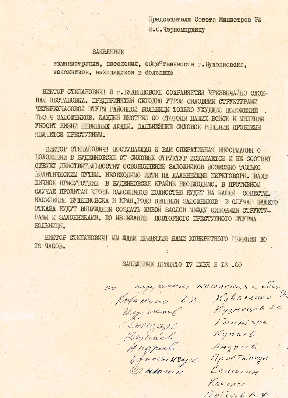 Обращение заложников, жителей и администрации г. Буденновска к В. С. Черномырдину. 17 июня 1995