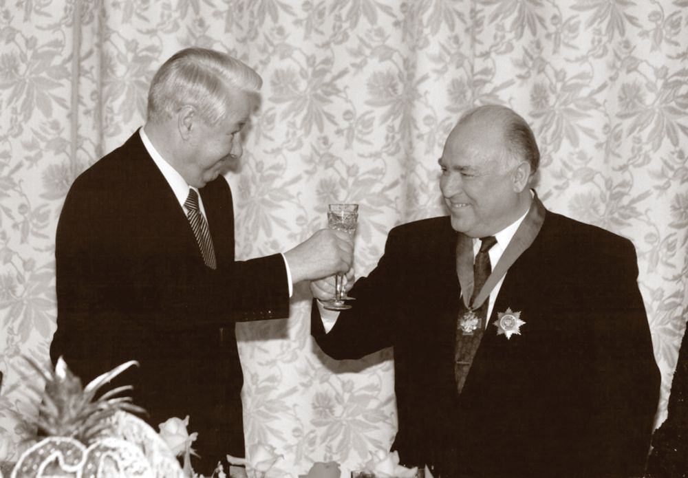 На приеме по случаю 60-летия В. С. Черномырдина в Доме приемов на Воробьевых горах. Б. Н. Ельцин награждает В. С. Черномырдина орденом «За заслуги перед Отечеством» II степени. 9 апреля 1998