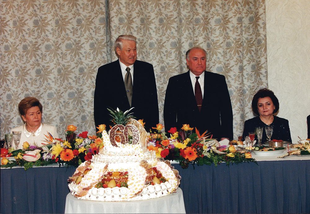 В Доме приемов Правительства РФ на Воробьевых горах по случаю 60-летнего юбилея В. С. Черномырдина. Б. Н. Ельцин с супругой Н. И. Ельциной и В. С. Черномырдин с супругой В. Ф. Черномырдиной. 9 апреля 1998
