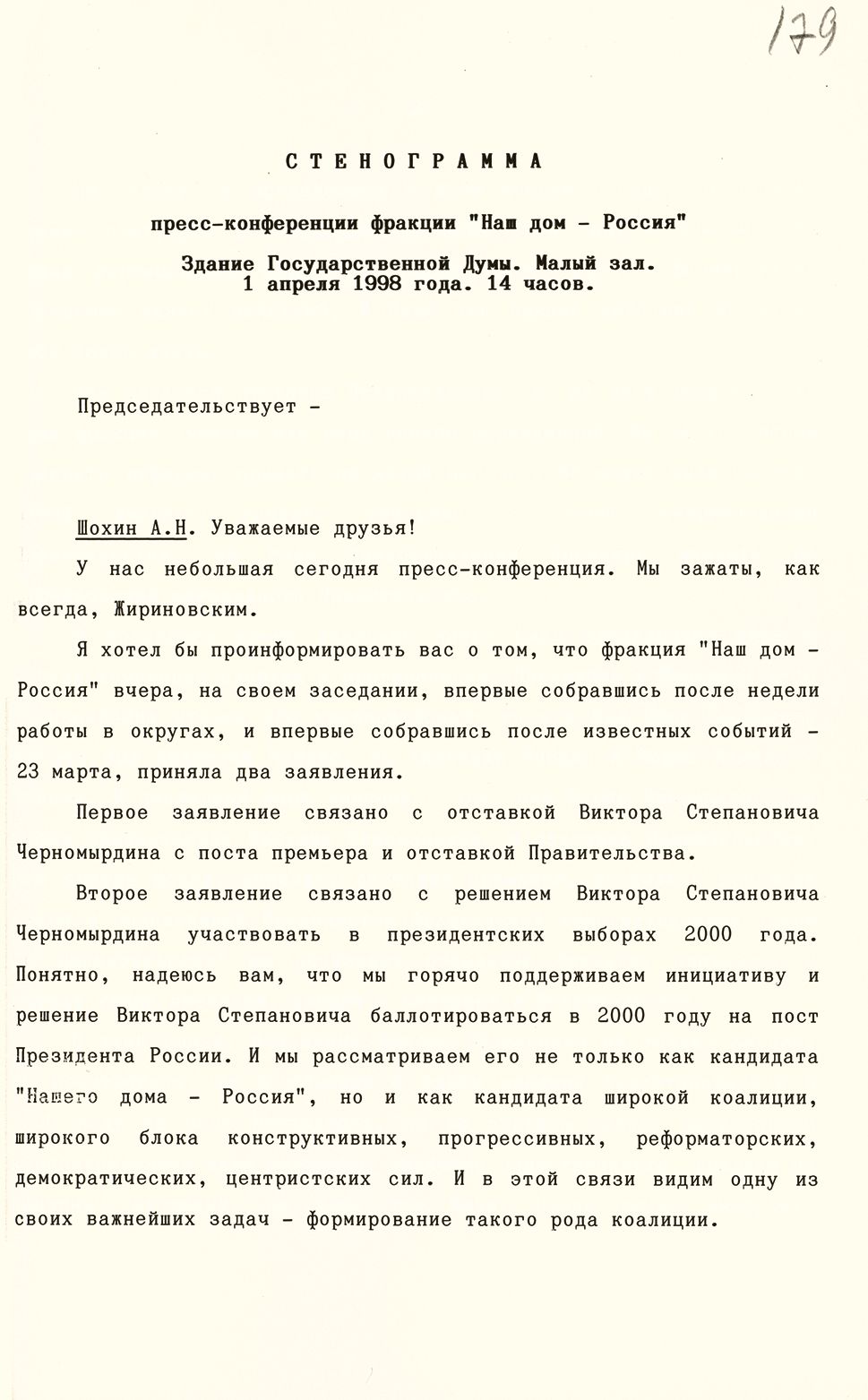 Из стенограммы пресс-конференции фракции «Наш дом – Россия» (поддержка решения В. С. Черномырдина баллотироваться в президенты). 1 апреля 1998