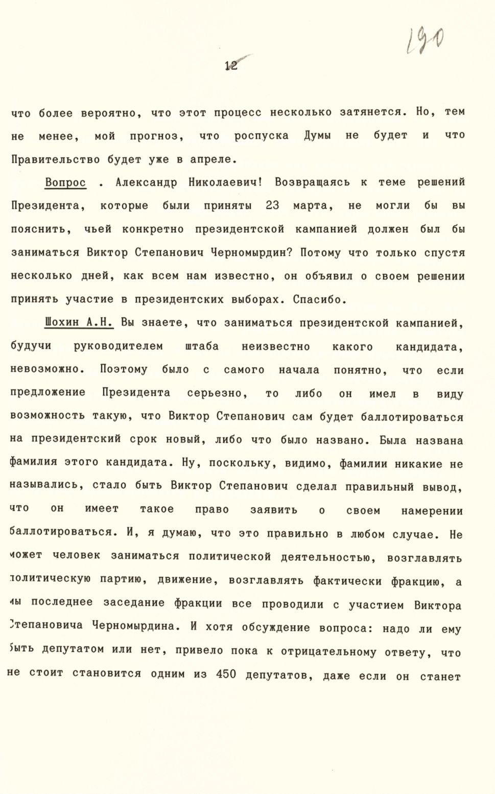 Ч. Да, действительно, речь идет о выборах президентских, и если я буду заниматься этой работой, то я принял решение выдвигаться как кандидат в президенты. И хочу объяснить, почему я принял такое решение. Мы обговаривали это с Борисом Николаевичем, и я так понял, что он согласен с такой позицией моей. Он так и сказал: Черномырдин идет и будет заниматься политической деятельностью… Почему я принял такое решение? Потому что я сегодня готов взять всю ответственность за страну.