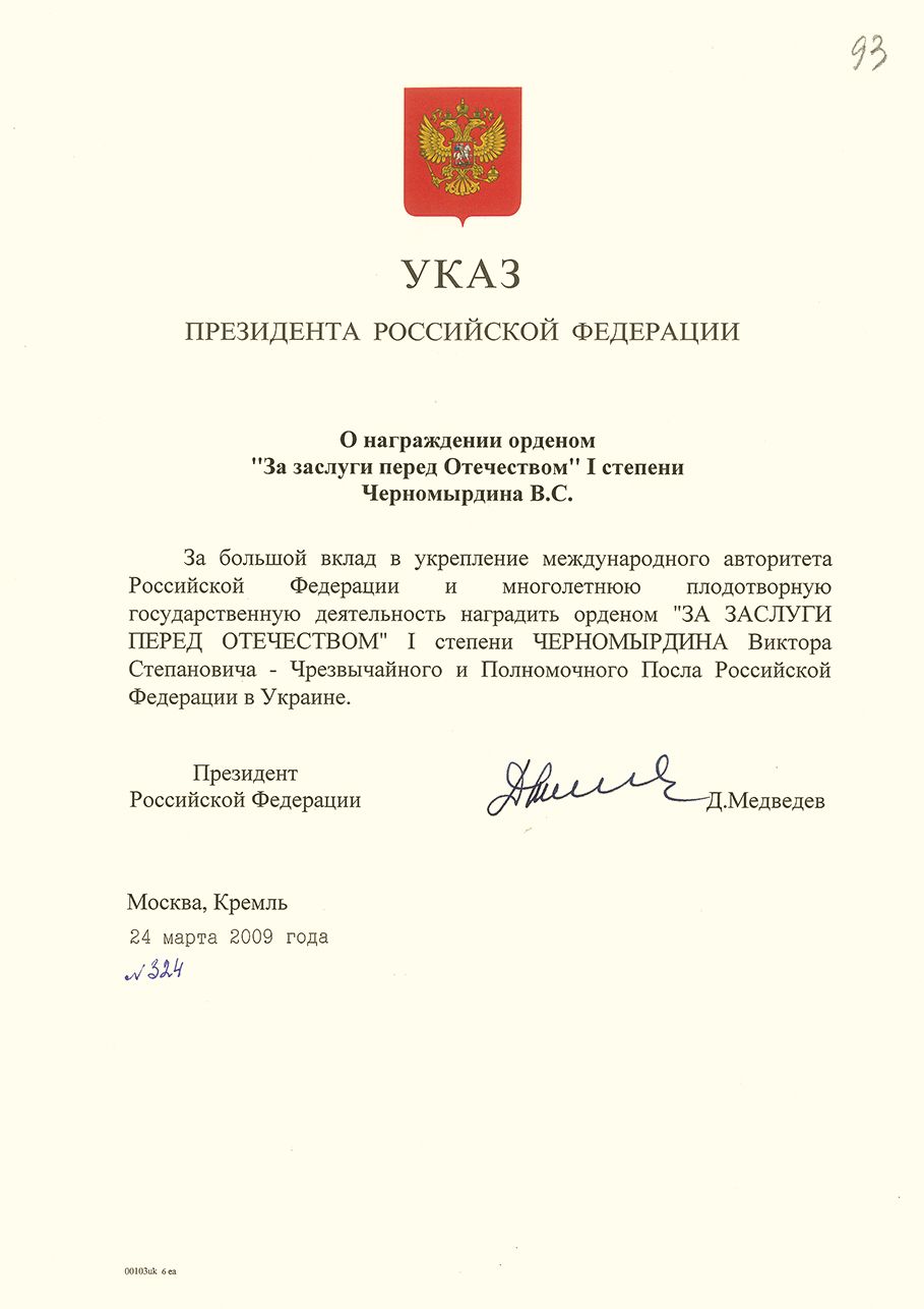 Указ Президента Российской Федерации «О награждении орденом “За заслуги перед Отечеством” I степени Черномырдина В. С.». 24 марта 2009
