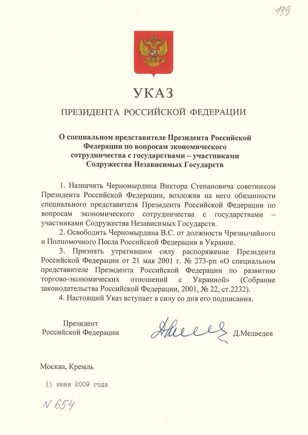 Указ Президента Российской Федерации о назначении В. С. Черномырдина специальным представителем Президента РФ по вопросам экономического сотрудничества с государствами – участниками СНГ. 11 июня 2009