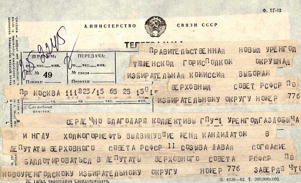 «Раз министр, значит – депутат, народный избранник!». Избирательная листовка о кандидате в депутаты ВС РСФСР В. С. Черномырдине и его благодарственная телеграмма коллективам выдвинувших его предприятий. 25 января 1985